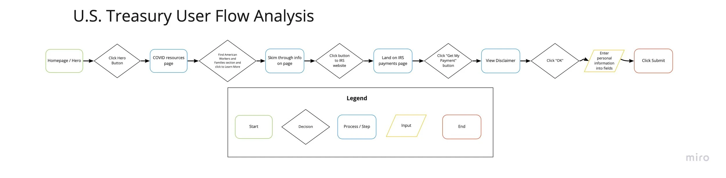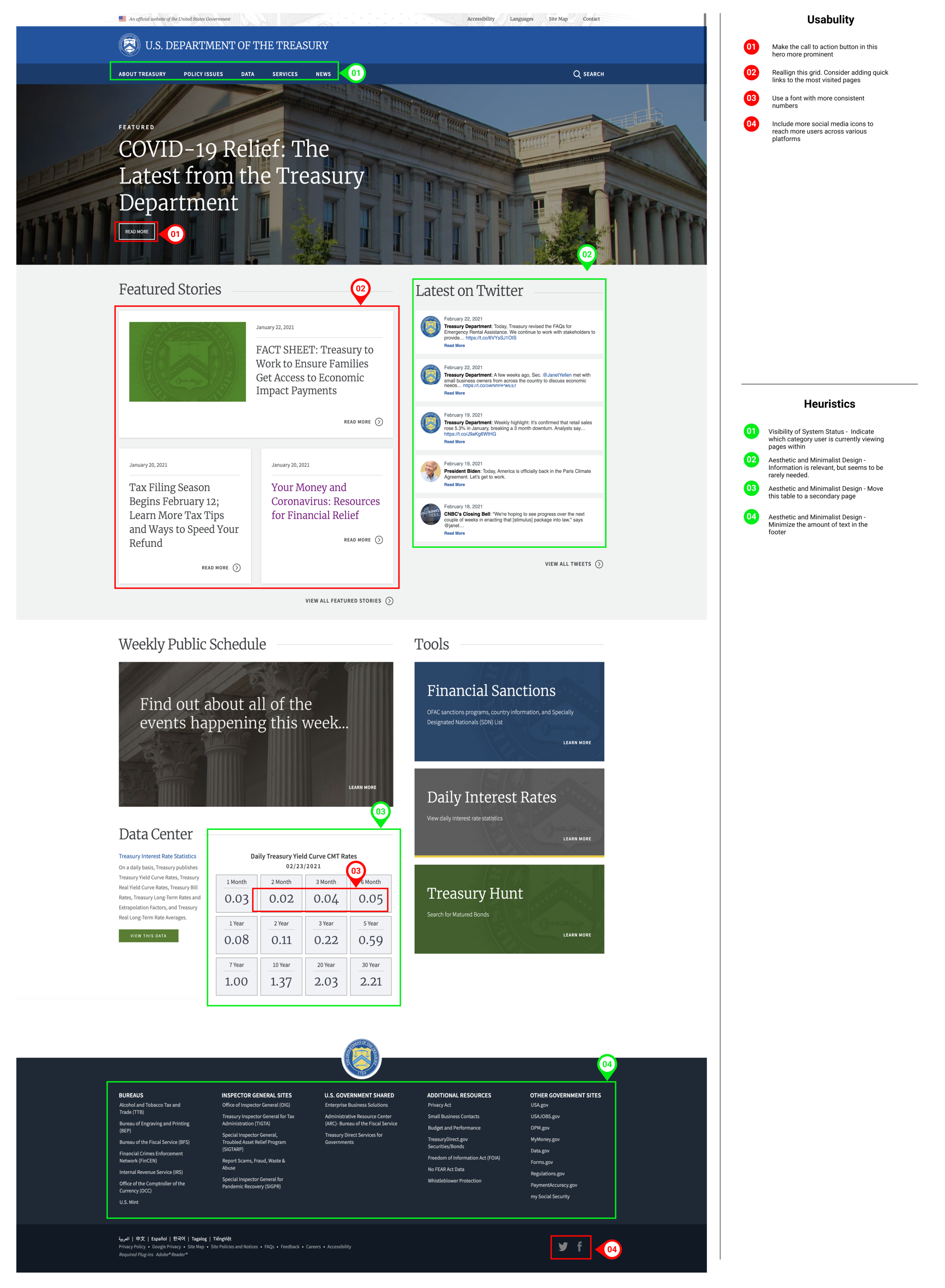 I carried out heuristic analysis on the current website to assess its usability and features. I wanted to redesign the Treasury’s website because users find it intimidating and difficult to navigate. It has not been organized in a logical, intuitive way, it offers limited FAQs or “help” resources, and highly sought-after resources are not given priority in the hierarchy of the information architecture. Also, the top navigation and footer menus are bloated and increase the cognitive load for users. A redesign could help make the site more beautiful, functional, and user friendly as well as help present the US Department of Treasury as an authority for government department websites around the world.