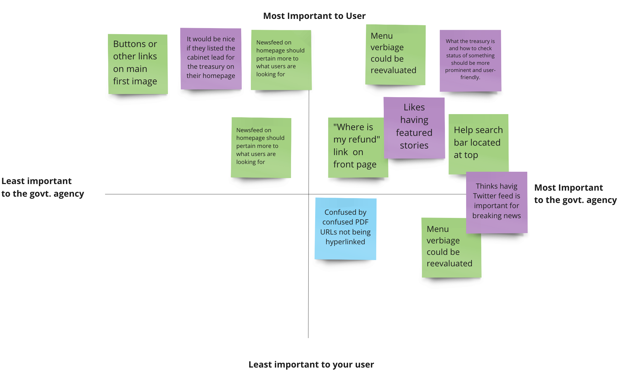 Feedback from user tests were plotted into a prioritization matrix to identify which insights or features were most important to both users, and the agency.